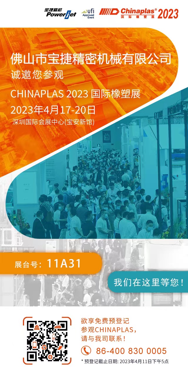 CHINAPLAS 2023國(guó)際橡塑展即將盛大開(kāi)啟,寶捷誠(chéng)邀你蒞臨11A31展位參觀交流!作為我司邀請(qǐng)的貴賓,您將獲得“免費(fèi)入場(chǎng)碼”,可豁免RMB80元的入場(chǎng)費(fèi),請(qǐng)通過(guò)以下“免費(fèi)門(mén)票領(lǐng)取方法”完成觀眾預(yù)登記手續(xù)。