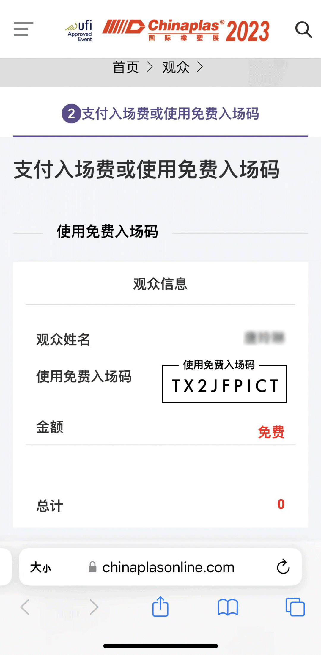 提交后,跳轉(zhuǎn)至[支付入場(chǎng)費(fèi)或使用免費(fèi)入場(chǎng)碼]頁(yè)面,將復(fù)制的免費(fèi)入場(chǎng)碼——TX2JFPICT,粘貼至輸入框中并提交。