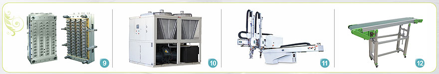 9.瓶坯模具 10.模具冷水機(jī) 11.伺服機(jī)械手 12.輸送帶 |